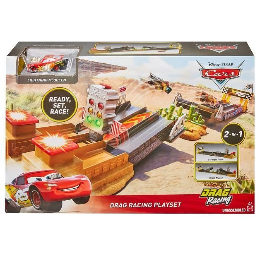 Coffret de jeu Cars inspiré de l'univers des courses de dragsters. Entrez dans le monde des courses de vitesse avec cette nouvelle piste modulable ! Placez les véhicules dans les starting blocks, lorsque le feu passe au vert appuyez sur les lanceurs pour les propulser à pleine puissance vers la ligne d'arrivée. Augmentez la difficulté en déployant le tremplin mais attention à ne pas attérir dans les cactus ! Un véhicule Flash McQueen XRS Drag Racing inclus.