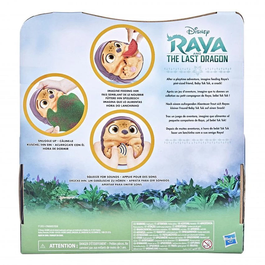 Dans Raya et le dernier dragon de Disney, la jeune et astucieuse Raya est toujours prête à partir à l'aventure avec son meilleur ami, Bébé Tuk Tuk. La petite taille de ce dernier lui permet de se glisser dans des endroits interdits, ce qui en fait un compagnon idéal, tant qu'il ne se laisse pas distraire par la nourriture ! Avec ce Bébé Tuk Tuk adorable, les enfants peuvent faire semblant de nourrir le petit compagnon de Raya et le blottir dans une couverture confortable. Mais ce n'est pas tout, car ce Bébé Tuk Tuk émet des sons quand on appuie sur son ventre. Il vient aussi avec un ami scarabée qui lui tient compagnie. Le jouet inclut 3 accessoires (un melon d'eau, une banane et une carotte). Ce jouet aux sons adorables a sa place dans la collection de poupées Raya et le dernier dragon des enfants. D'autres personnages comme Raya, Sisu et Namaari sont également disponibles. Vendus séparément, dans la limite des stocks. Copyright Disney Hasbro et tous les termes associés sont des marques de commerce de Hasbro.
