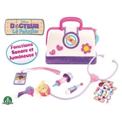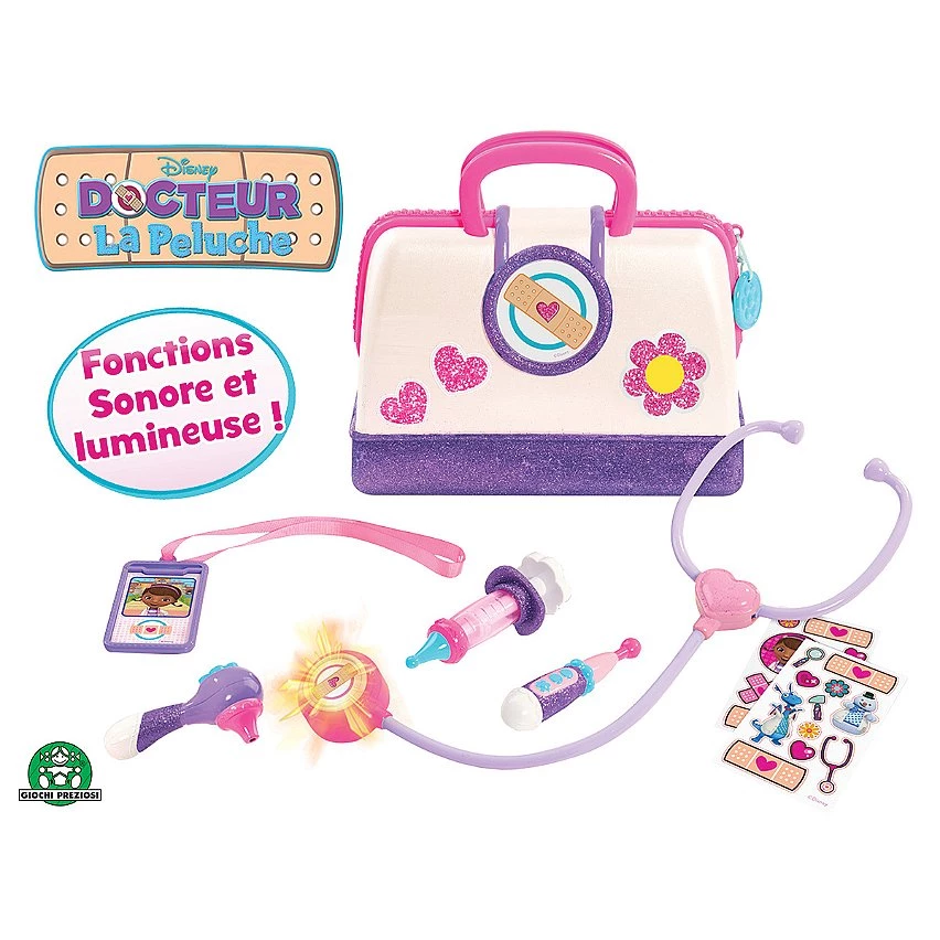 | Plus produit | COMME DANS TON DESSIN ANIMÉ: Toi aussi, soigne tous les bobos avec la mallette Hôpital de Docteur La Peluche!\n UNE MALLETTE ULTRA COMPLÈTE: Plein d\'accessoires pour faire tous tes diagnostics.\n FONCTIONS SONORES ET LUMINEUSES: C\'est magique, appuie sur le stéthoscope, il s\'illumine avec des effets sonores.\n 8 PIÈCES INCLUSES: Une mallette de Doc, 1 otoscope, 1 stéthoscope sonore et lumineux, 1 thermomètre, 1 seringue, 1 badge officiel de l\'hôpital de jouets et deux feuilles dautocollants.\n AGE : pour les enfants à partir de 3 ans.\n\n PILES REQUISES : Fonctionne avec 3 piles AG13 incluses.\n |