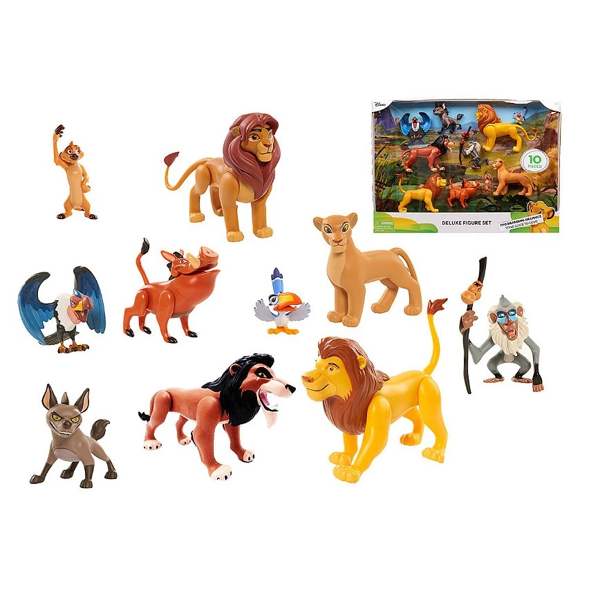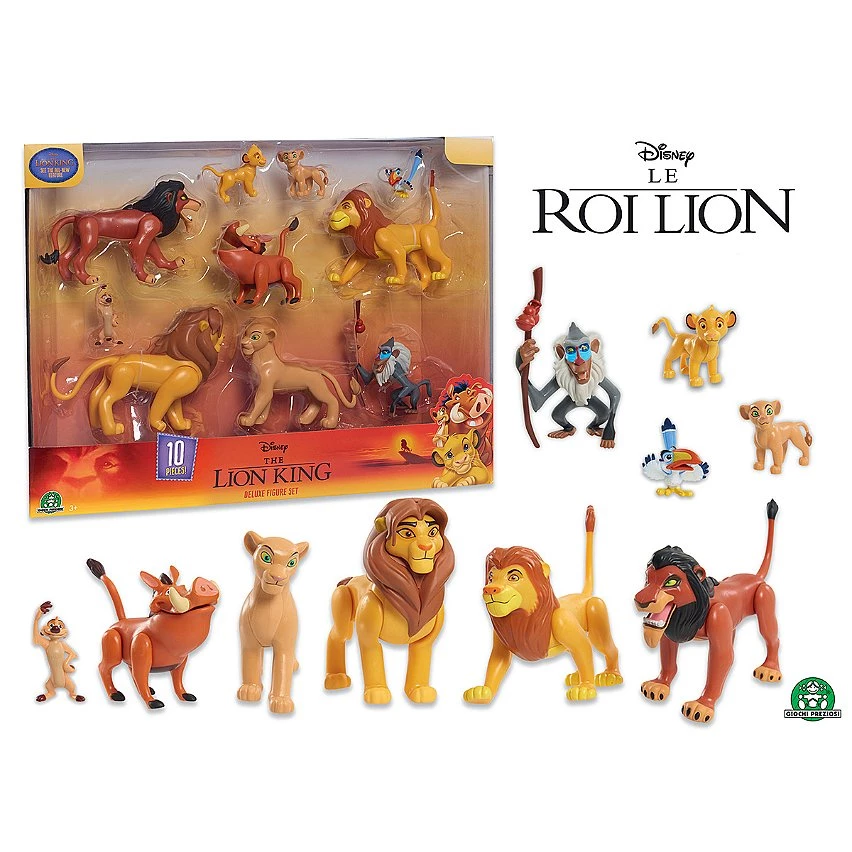 | Plus produit | DESSIN ANIMÉ: Retrouve les héros emblématiques du dessin animé Disney devenu un classique : Le Roi Lion ! COFFRET COMPLET:\nUn coffret de 10 figurines regroupant les personnages clés du dessin animé. CONTIENT : Le coffret contient 10 figurines : Simba, Nala, Rafiki, Timon, Pumbaa, Zazu, Simba jeune, Nala jeune, Mufasa et Scar. FIGURINES DÉTAILLÉES : Des figurines hyper réalistes ! Comme dans le dessin animé. HAKUNAMATATA ! |