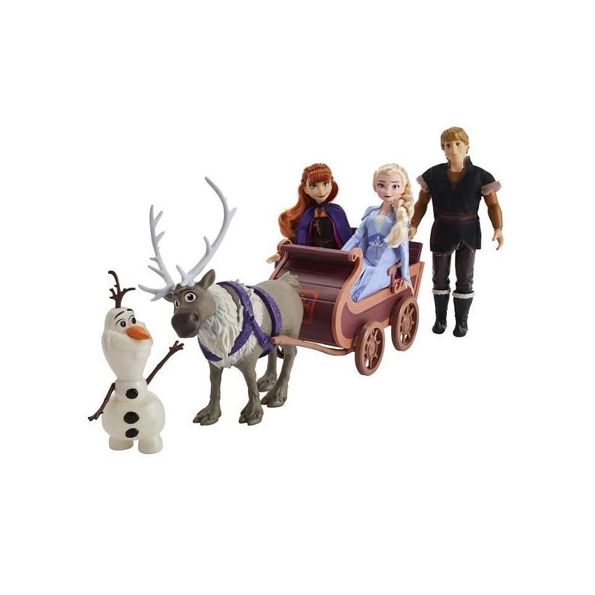 | Plus produit | CINQ JOUETS DANS UN MÊME COFFRET : Ce coffret de Disney Frozen inclut les poupées mannequins Anna et Elsa, une poupée Kristoff, une figurine Olaf ainsi qu\'une figurine Sven pour des heures de jeu avec La Reine des neiges AVENTURES EN TRAÎNEAU : Les personnages peuvent s\'asseoir à tour de rôle dans le traîneau inclus pour que les enfants imaginent une promenade en traîneau aux alentours d\'Arendelle TRAÎNEAU MOBILE : Le traîneau a des roues qui permettent aux enfants de faire glisser leurs personnages préférés comme sur un vrai traîneau (piles non requises) TENUES ET ACCESSOIRES INSPIRÉS DU FILM : Les poupées Anna, Elsa et Kristoff portent chacune une tenue et des bottes inspirées des tenues des personnages dans le film de Disney, La Reine des neiges 2 POUR ENFANTS, À PARTIR DE 3 ANS : Les fans des films de La Reine des neiges aimeront recevoir ce coffret de personnages populaires en cadeau d\'anniversaire ou pour les fêtes. Ils pourront ainsi recréer des scènes ou imaginer leurs propres aventures |