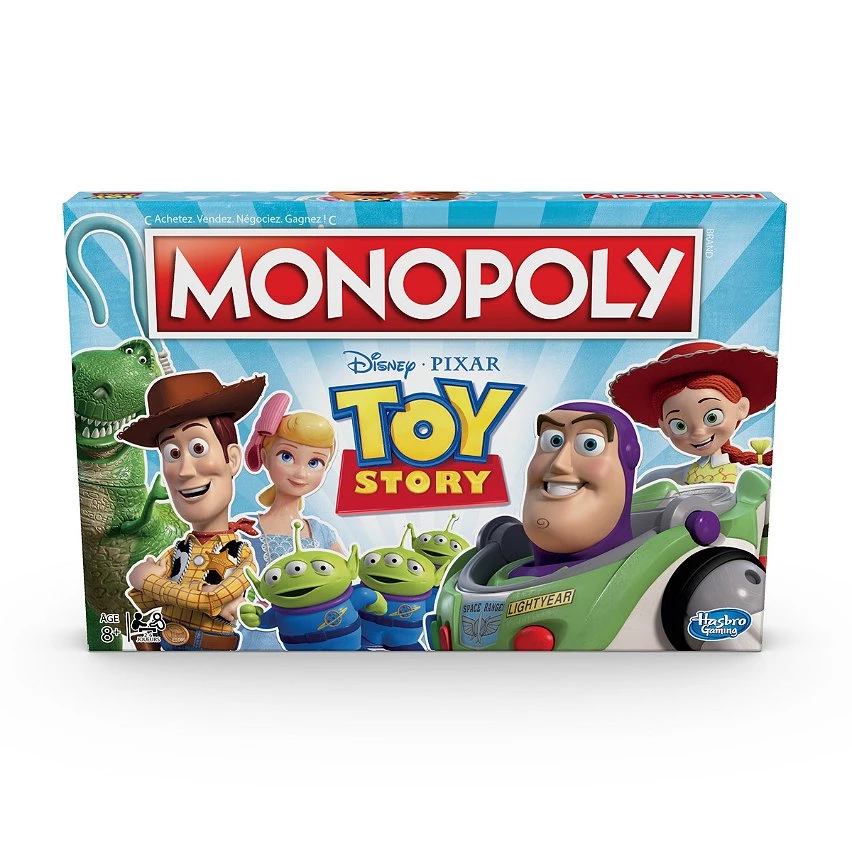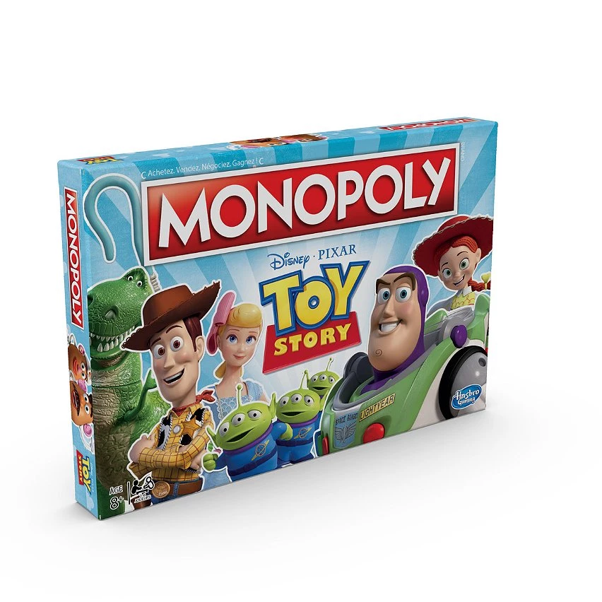 | Plus produit | Monopoly Toy Story : jeu de société où le but du jeu est d\'être l\'ultime joueur à ne pas faire faillite dans le monde de Toy Story comme dans le Monopoly Classique. Choisissez votre personnage préféré (Buzz l\'Eclair, Woody…?), achetez, vendez et échangez des lieux du nouveau film d\'animation pour enfants ! Version française.\nPrincipe du jeu : comme dans le Monopoly Classique : les joueurs parcourent le plateau pour acheter le plus de propriétés possibles. Plus ils en possèdent, plus ils ont de chance de récolter des loyers. Le dernier joueur à ne pas faire faillite remporte la partie.\nDe 2 à 6 joueurs. Temps de la partie : environ 45 minutes. Âge recommandé : à partir de 8 ans.\nVous aimez les jeux de société et partager un moment en famille ou entre amis ? Monopoly Toy Story est le jeu parfait à offrir en cadeau pour les enfants, filles et garçons de 8 ans, 9 ans, 10 ans et plus. |