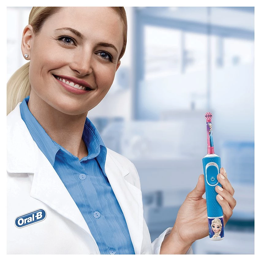 La brosse à dents électrique Oral-B Kids à l’effigie de Disney La reine des neiges, adaptée à partir de 3 ans, offre le nettoyage doux et efficace d’une brosse à dents Oral-B recommandée par les dentistes. Avec 2 modes de brossage, dont un mode sensible unique adapté aux enfants, cette brosse nettoie en douceur les dents des enfants. Elle élimine plus de plaque dentaire qu’une brosse à dents manuelle classique. Quatre autocollants Disney La reine des neiges sont inclus pour personnaliser le manche..